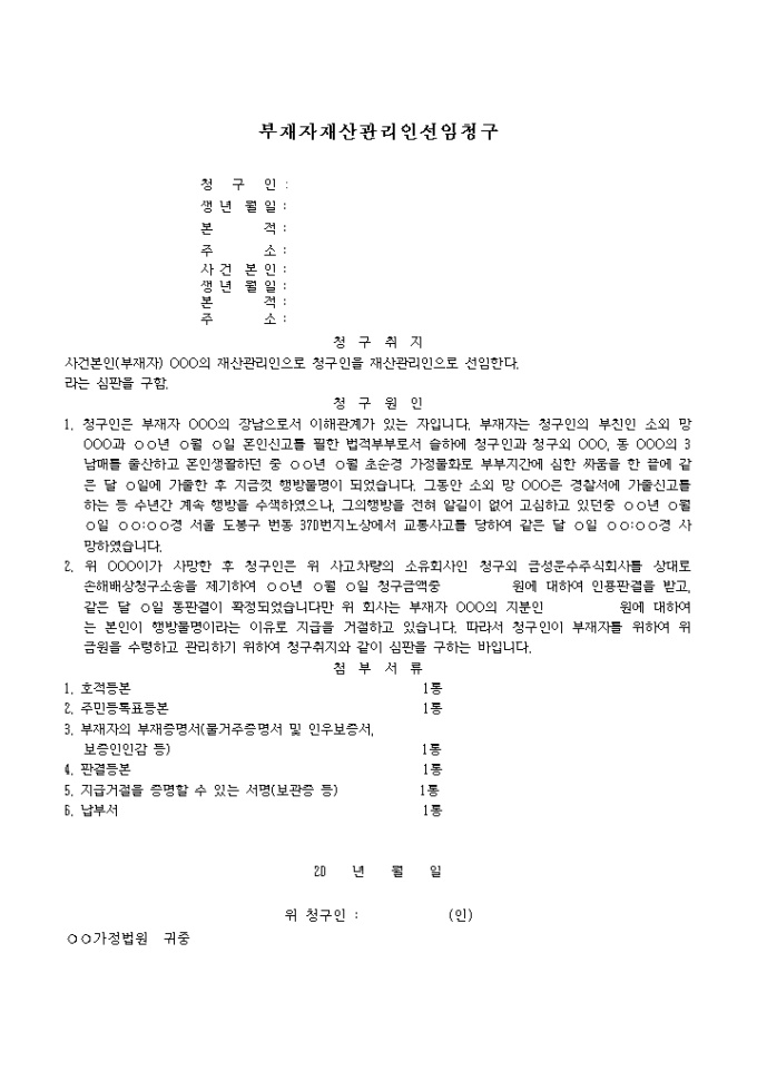 9,000원/월사건본인(부재자)의 재산관리인으로 청구인을 선임할 것을 요청할 때 사용하는 양식입니다.