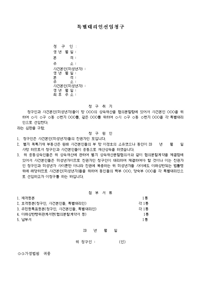 9,000원/월청구인과 사건본인(미성년자)들이 상속재산을 협의분할함에 있어서 사건본인을 위하여 명시한 특정인을 특별대리인으로 선임 요청할 때 사용하는 양식입니다.