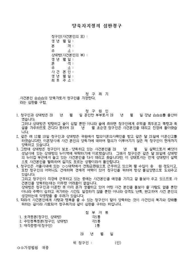 9,000원/월(부모가 이혼한 경우)사건본인의 양육자로서 청구인을 지정함을 요청할 때 사용하는 청구서 양식입니다.
