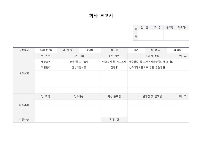 9,000원/월회사보고서입니다. 금주실적, 업무명, 업무내용, 진행사항, 결과 및 산출, 차주계획, 업무명, 업무내용, 예상종료일, 문제점 및 결과물, 요청사항 등의 항목으로 구성되어있습니다.