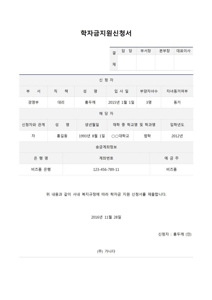 9,000원/월학자금지원신청서 입니다. 신청자 부서, 직책, 성명, 입사일, 부양자녀수, 자녀동거여부, 신청자와의 관계, 해당자 성명, 생년월일, 재학중 학교명, 학과명, 입학년도 송금계좌번호 등의 항목으로 구성되어있습니다.