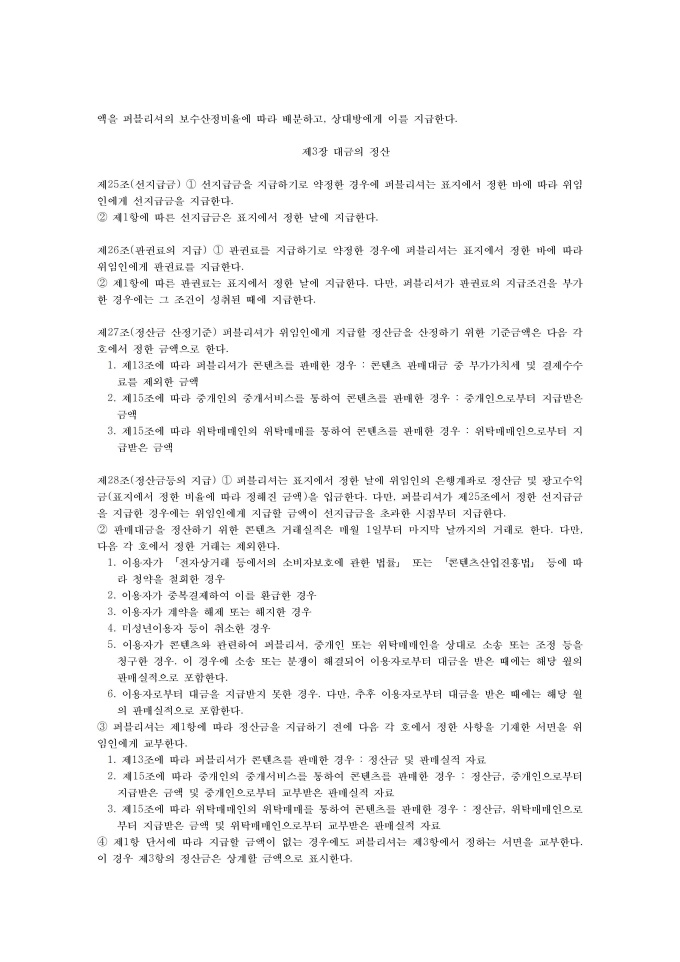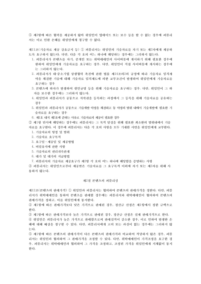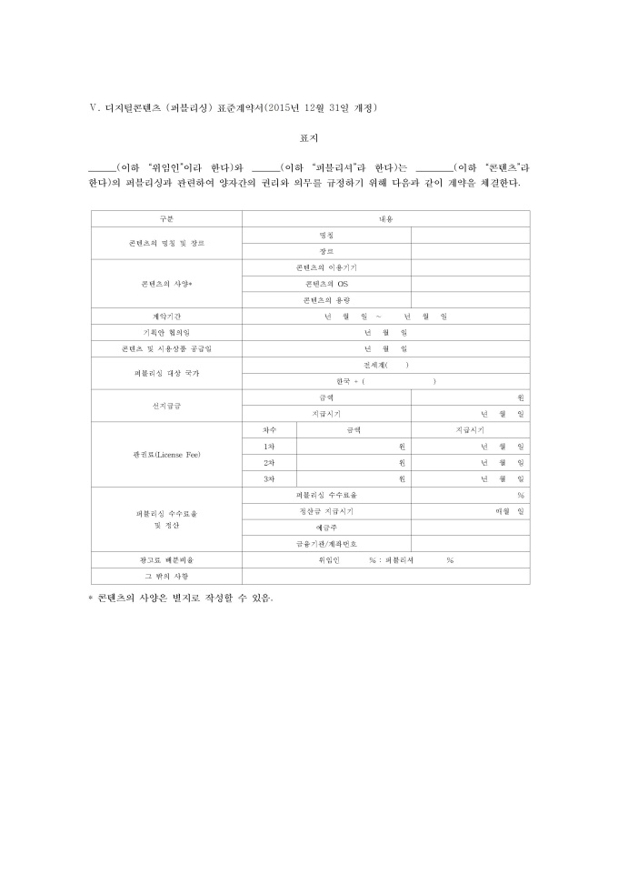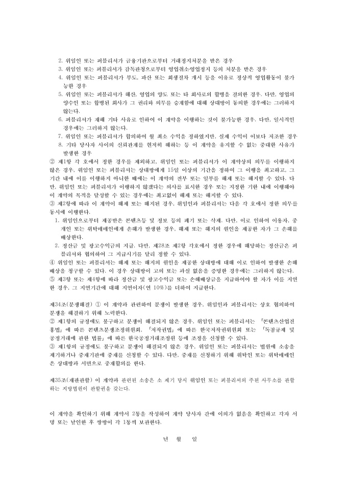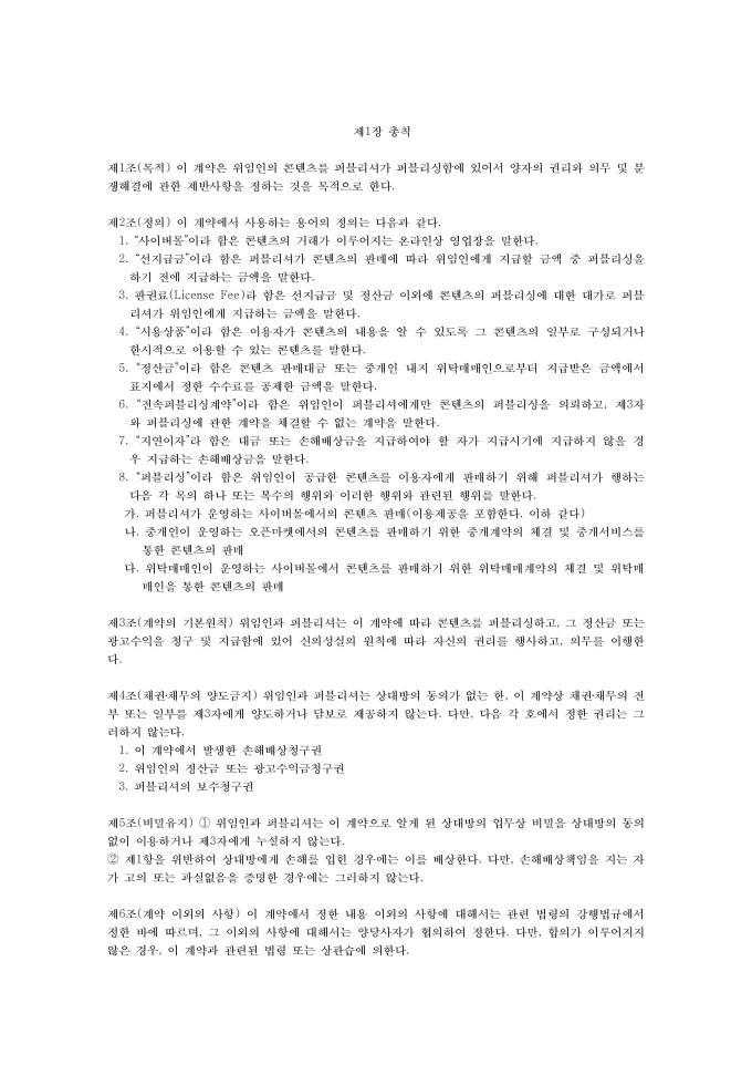 9,000원/월미래창조과학부에서 불공정거래에 취약한 중소 디지털콘텐츠 사업자를 보호하고 공정한 디지털콘텐츠 산업 거래질서 조성을 위하여 거래 단계별로 마련한 표준계약서입니다. ■ 서식설명 : 콘텐츠제작자 등을 대신하여 퍼블리셔가 다양한 방법으로 콘텐츠를 유상으로 제공하고, 그 대금을 정산하는 것을 내용으로 하는 계약에서 사용하는 계약서입니다. - 본 콘텐츠는 미래창조과학부 산하 DC상생협력지원센터에서 비즈폼에 요청하여 업로드 된 문서입니다. ※ 출처 : 미래창조과학부