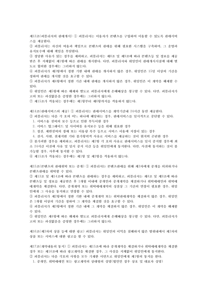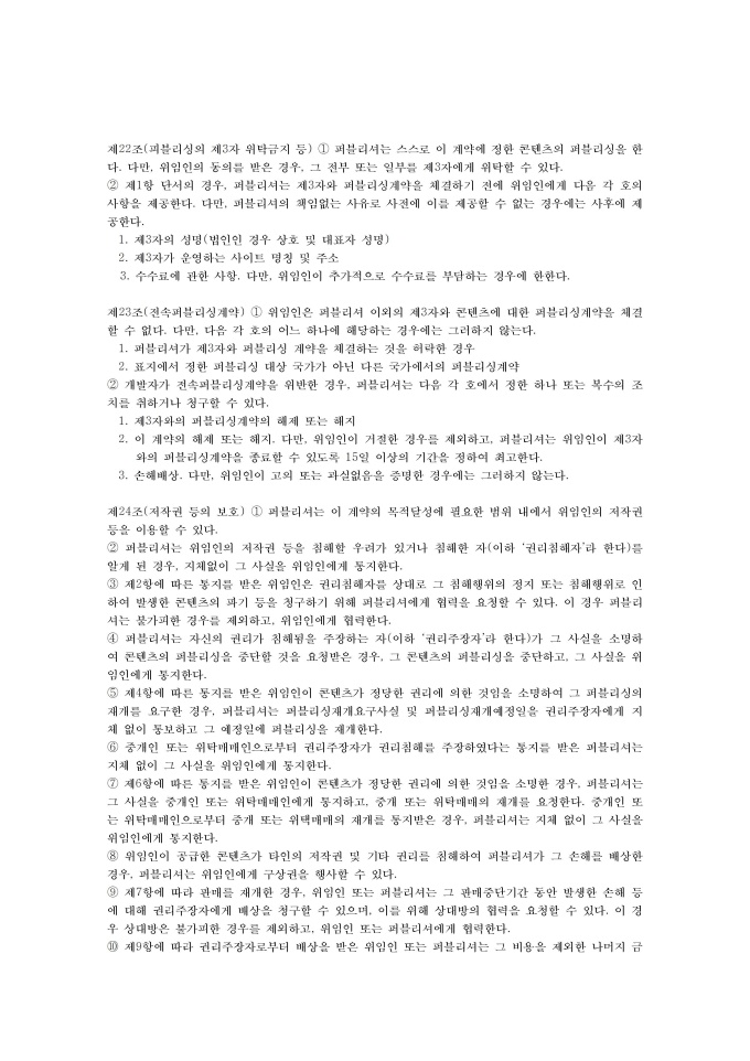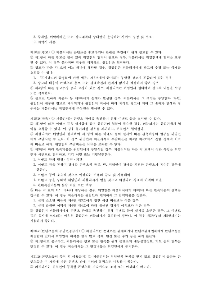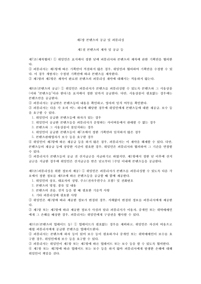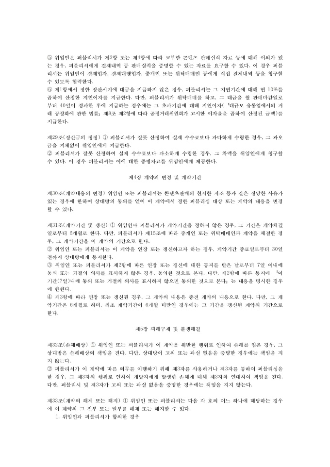9,000원/월미래창조과학부에서 불공정거래에 취약한 중소 디지털콘텐츠 사업자를 보호하고 공정한 디지털콘텐츠 산업 거래질서 조성을 위하여 거래 단계별로 마련한 표준계약서입니다. ■ 서식설명 : 콘텐츠제작자 등을 대신하여 퍼블리셔가 다양한 방법으로 콘텐츠를 유상으로 제공하고, 그 대금을 정산하는 것을 내용으로 하는 계약에서 사용하는 계약서입니다. - 본 콘텐츠는 미래창조과학부 산하 DC상생협력지원센터에서 비즈폼에 요청하여 업로드 된 문서입니다. ※ 출처 : 미래창조과학부