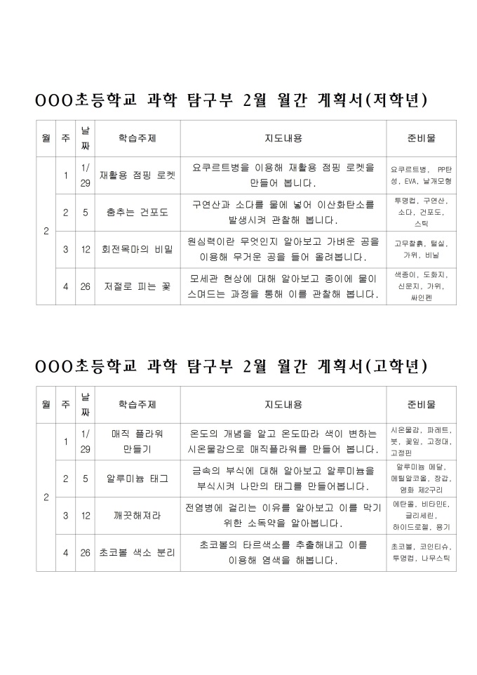 9,000원/월방과후학교 과학과목의 월간수업계획서 입니다. [학습내용] 재활용 점핑 로켓 춤추는 건포도 회전목마의 비밀 저절로 피는 꽃 매직 플라워 만들기 알루미늄 태그 깨끗해져라 초코볼 색소 분리