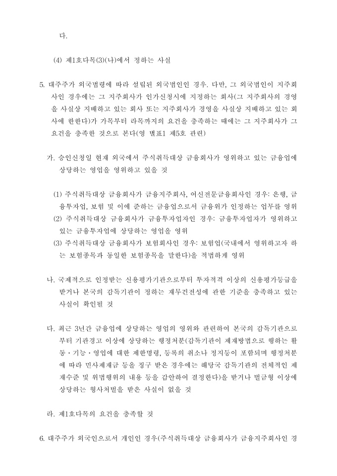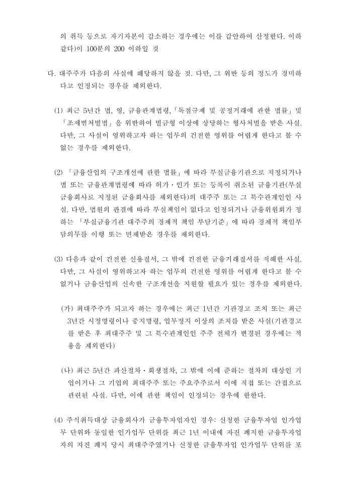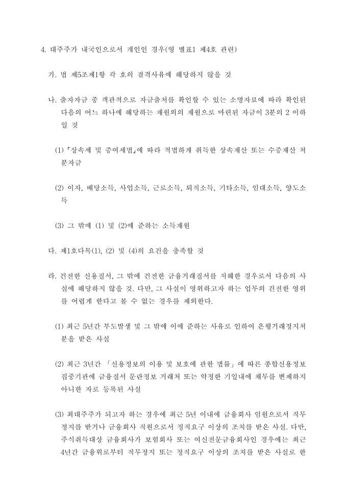 9,000원/월대주주 변경승인의 요건입니다. 금융위원회고시 금융회사지배구조감독규정 제 15조 3항 2016.07.28 ※ 출처 : 국가법령정보센터