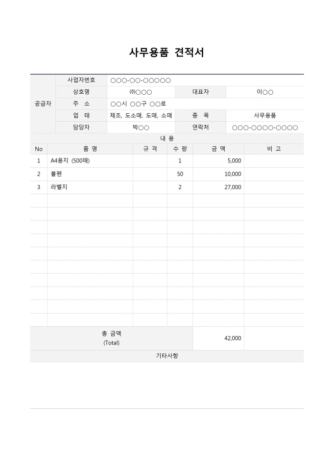 9,000원/월사무용품 견적서 입니다. 공급자, 사업자번호, 상호명, 대표자, 주소, 업태, 종목, 담당자, 연락처, No, 품명, 규격, 수량, 금액, 비고, 총액, 기타사항등의 항목으로 구성되어 있습니다.