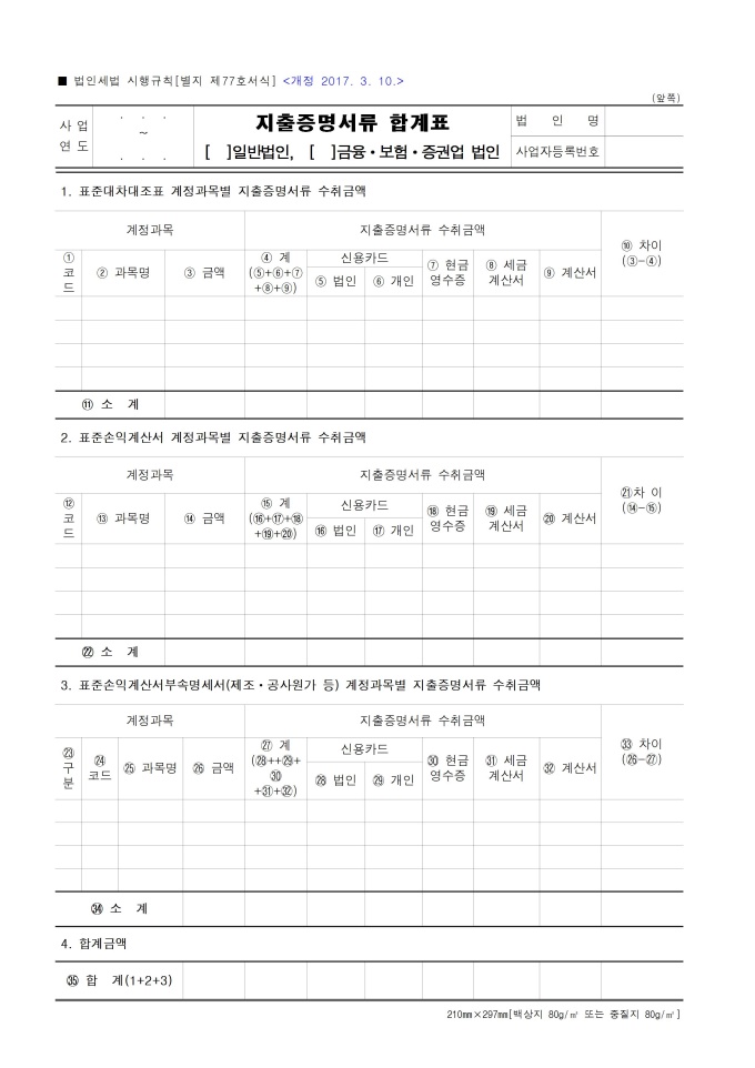 9,000원/월지출증명서류 합계표(일반법인, 금융, 보험, 증권업 법인) 입니다. ※출처 : 기획재정부