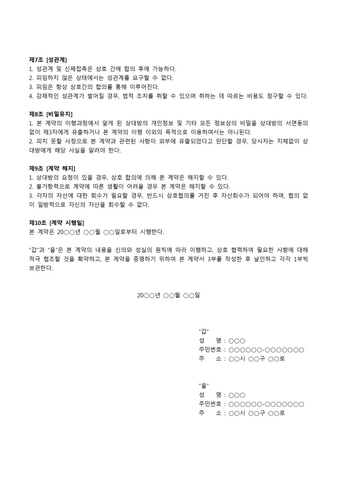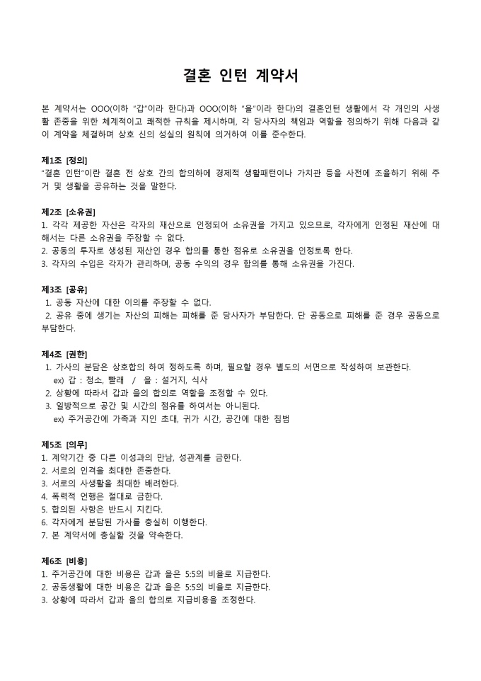 9,000원/월결혼 인턴 계약서 입니다. 남녀가 동거를 할 때 결혼과 비슷한 형태로 생활을 하는 것에 대하여 계약 내용을 작성하여 이행하도록 하는 문서입니다.