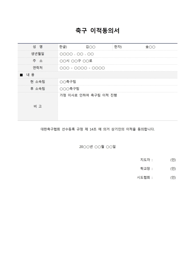 9,000원/월축구이적동의서입니다. 성명, 생년월일, 주소, 연락처, 현 소속팀, 후소속팀, 비고등의 항목으로 구성되어 있습니다.
