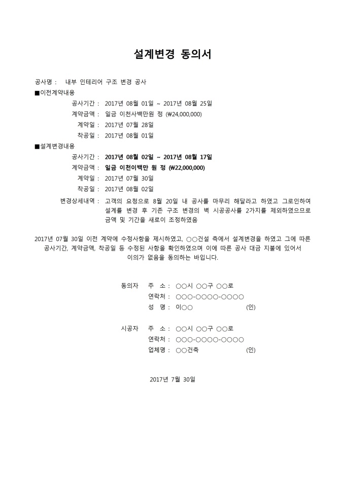 9,000원/월설계변경 동의서입니다. 공사명, 이전계약내용, 설계변경내용, 변경상세내역, 동의자, 시공자 등의 항목으로 구성되어 있습니다.