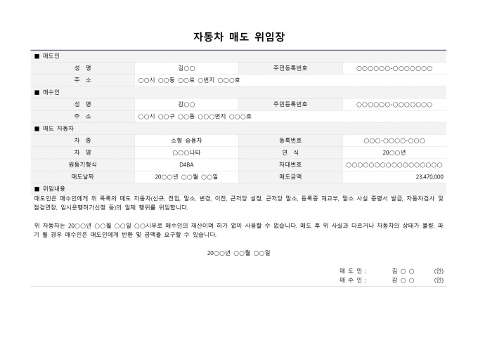 9,000원/월자동차매도위임장입니다. 매도인 성명, 주민등록번호, 주소, 매수인 성명, 주민등록번호, 주소, 차종, 등록번호, 차명, 연식, 원동기형식, 차대번호, 매도날짜, 매도금액, 위임내용 등의 항목으로 구성되어 있습니다.
