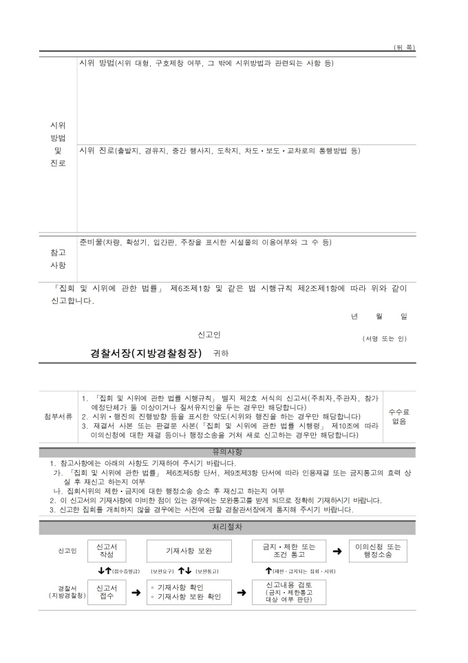 9,000원/월집회 및 시위/행진에 대한 개요, 관련자 정보, 참가 단체 인원, 시위방법, 참고사항 등에 내용을 신고할 때 사용합니다.