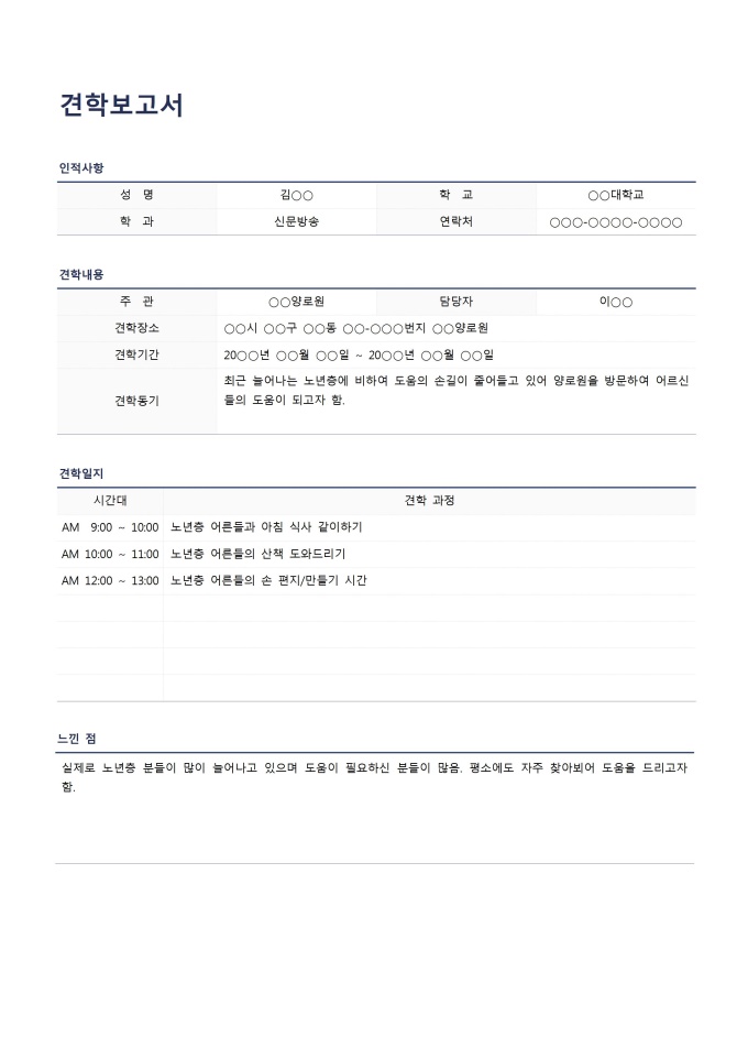 9,000원/월견학보고서입니다. 성명, 학교, 학과, 연락처, 견학내용 주관, 담당자, 견학장소, 견학기간, 견학동기, 견학일지 시간대, 견학과정, 느낀 점 등의 항목으로 구성되어 있습니다.