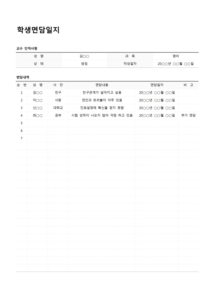 9,000원/월학생면담일지입니다. 성명, 과목, 상태, 작성일자, 면담내역, 순번, 성명, 사안, 면담내용, 면담일자, 비고 등의 항목으로 구성되어 있습니다.