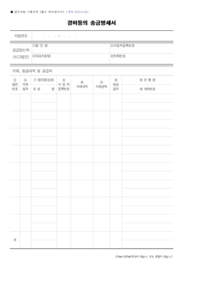 9,000원/월적격증빙서류를 수취하지 않아도 되는 특례규정중에 하나인 경비등의 송금명세서입니다. (※기획재정부 최신개정판)