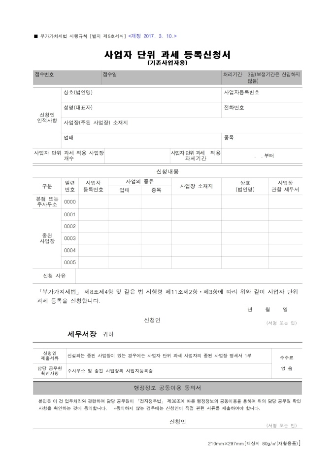 9,000원/월여러개의 사업을 소유하고 있는 경우 주된 사업장에서 하나의 사업자 등록을 하여 신고와 납부를 등록할 때 사용하는 신청서입니다. (출처: 기획재정부 최신개정판)