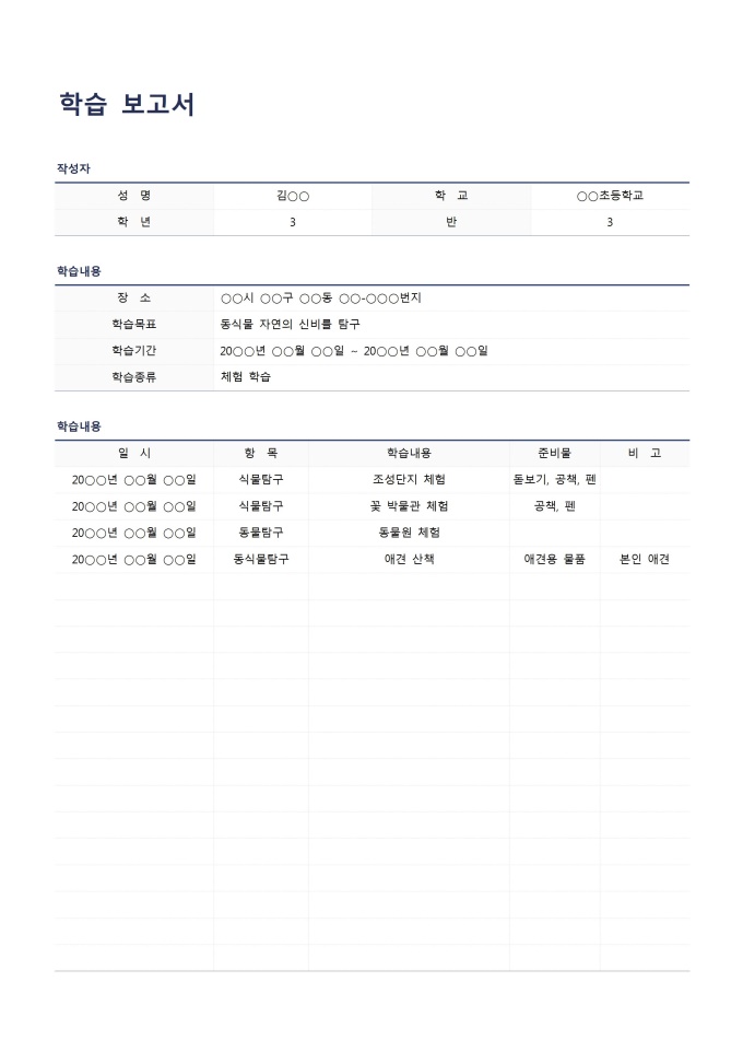 9,000원/월학습보고서입니다. 성명, 학교, 학년, 반, 장소, 학습목표, 학습기간, 학습종류, 일시, 항목, 학습내용, 준비물, 비고 등의 항목으로 구성되어 있습니다.