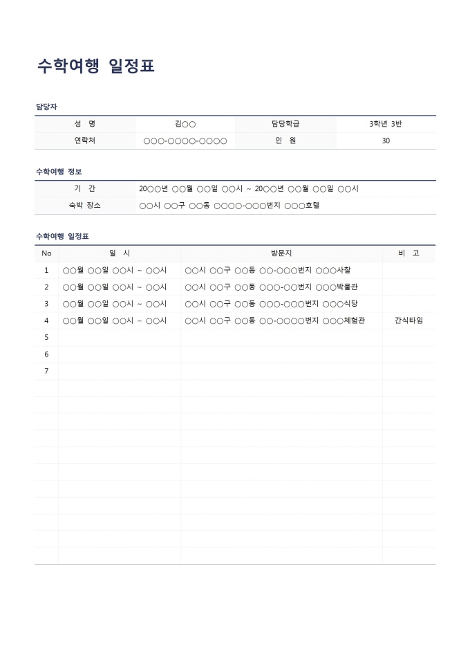 9,000원/월수학여행일정표입니다. 성명, 담당학급, 연락처, 인원, 기간, 숙박장소, No, 일시, 방문지, 비고 등의 항목으로 구성되어 있습니다.