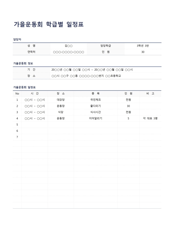 9,000원/월가을운동회학급별일정표입니다. 성명, 담당학급, 연락처, 인원, 기간, 장소, No, 시간, 장소, 종목, 인원, 비고 등의 항목으로 구성되어 있습니다.