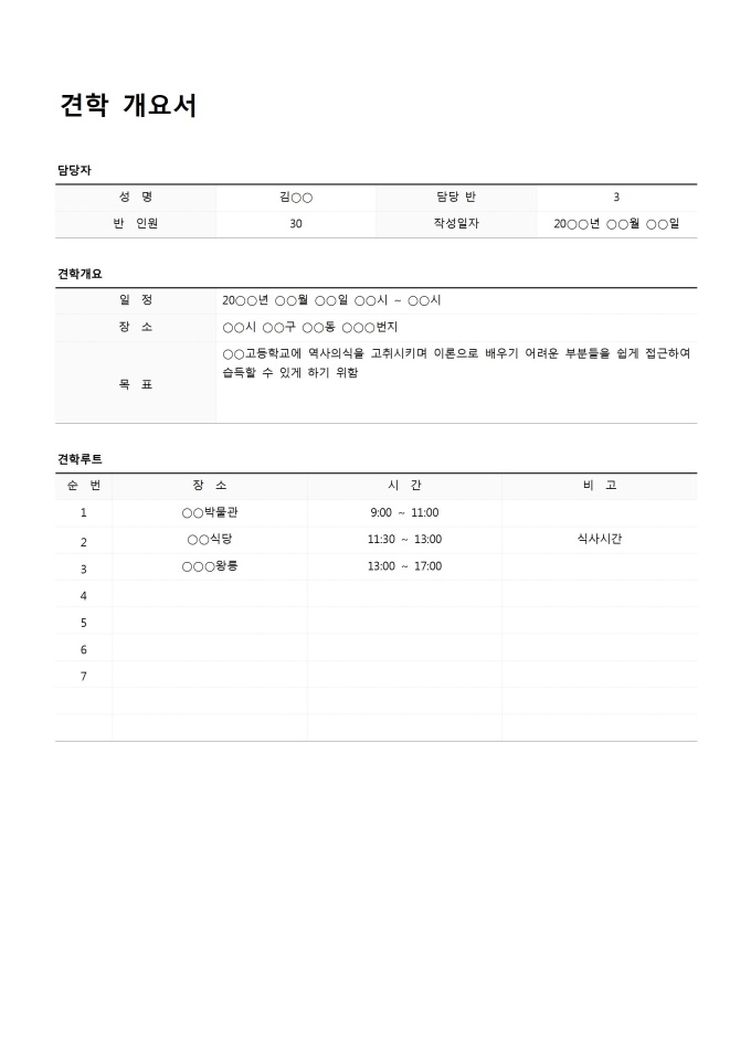 9,000원/월견학개요서입니다. 성명, 담당 반, 반 인원, 작성일자, 일정, 장소, 목표, 순번, 장소, 시간, 비고 등의 항목으로 구성되어 있습니다.