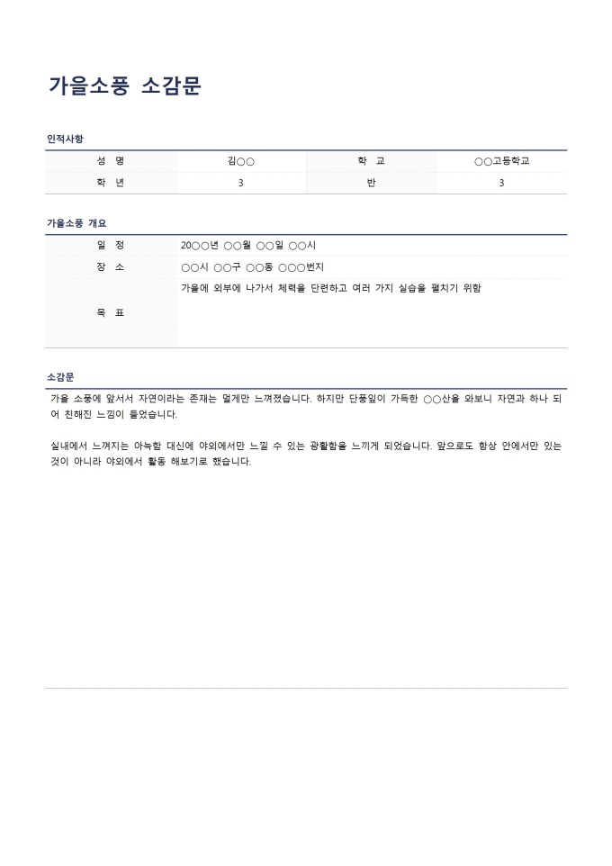 9,000원/월가을소풍소감문입니다. 성명, 학교, 학년, 반, 일정, 장소, 목표, 소감문 등의 항목으로 구성되어 있습니다.