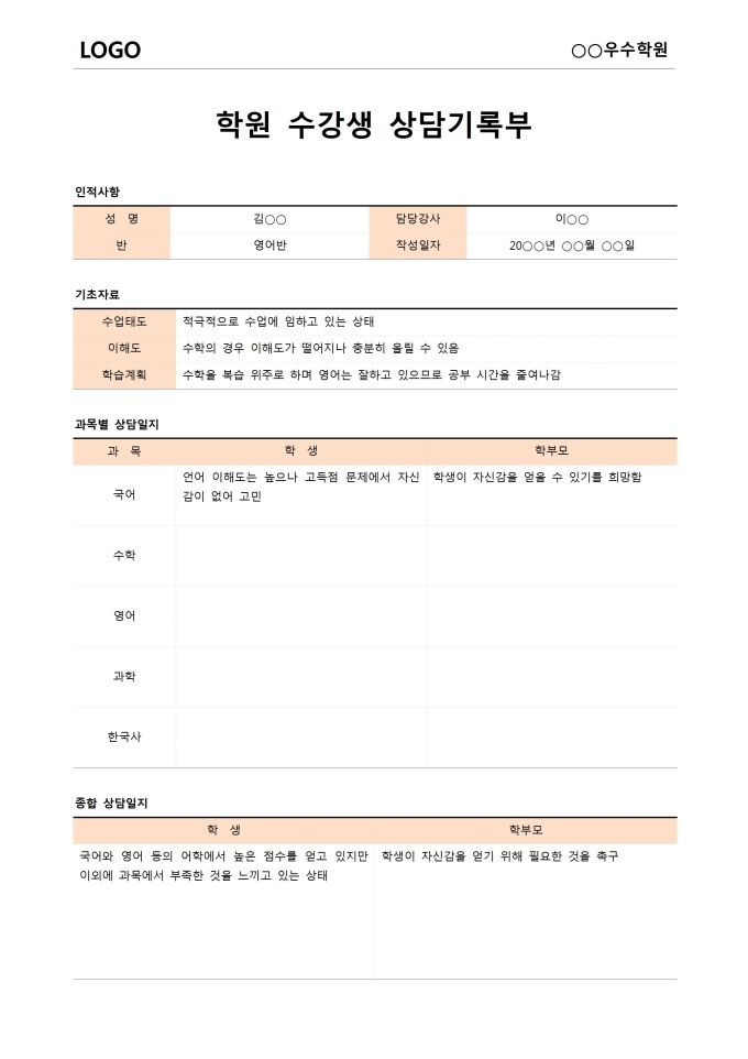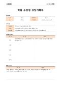 9,000원/월해당 서식은 학원의 현장, 실무에서 필요한 서식을 바탕으로 최적화된 학원 문서입니다. 샘플내용이 포함되어 있어 신입 강사부터 원장님까지 누구나 쉽고 편리하게 작성, 관리할 수 있습니다. 학원로고를 삽입하거나 학원명을 삽입하여 통일화된 양식으로 우리 학원만의 문서체계를 확립할 수 있습니다. 문서의 성격과 용도에 따라 안정적인 문서레이아웃으로 구성되어 문서 활용도가 높습니다. 학원 상담기록부 ▷ 용도 : 수강생과 상담한 내역을 작성하여 관리하는 서식입니다. ▷ 서식활용 TIP : 입학 전 또는 수강 중에 수강생과 상담을 실시하여 상담내용을 기록하여 맞춤형 교육을 실시할 수 있습니다. ☞ 학원 서식 기획전 보러가기 (click!)