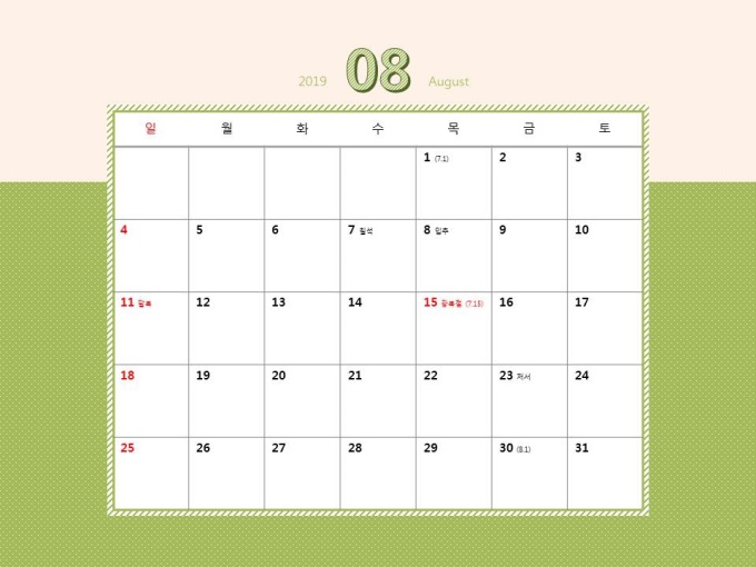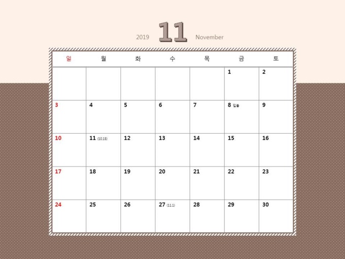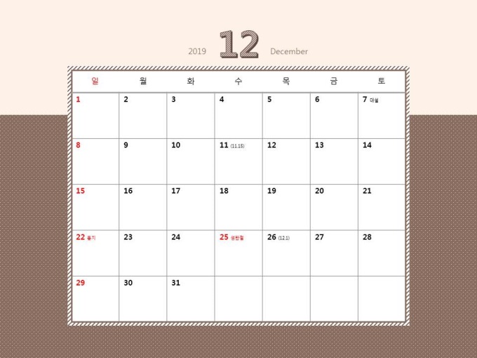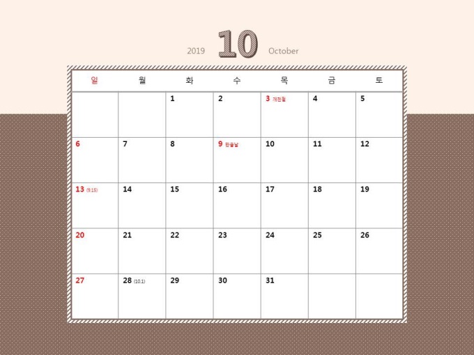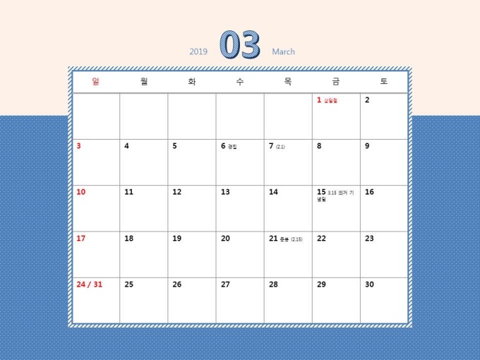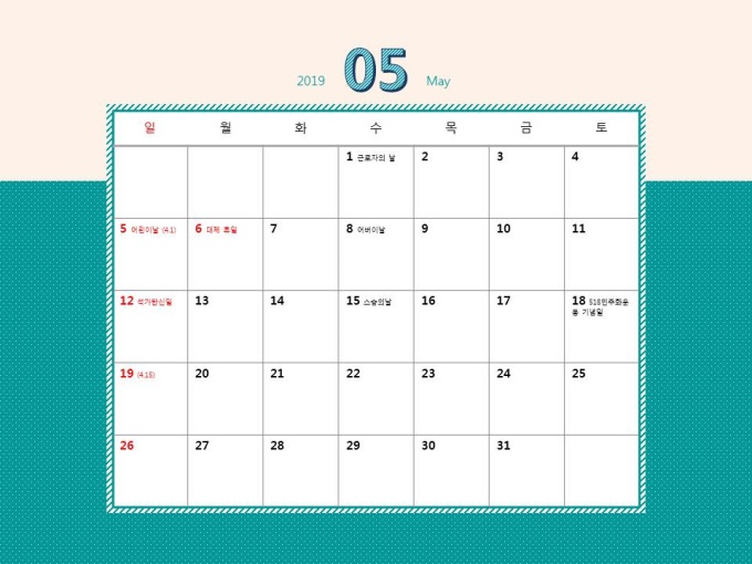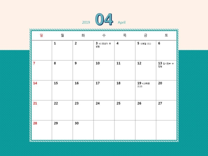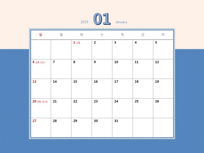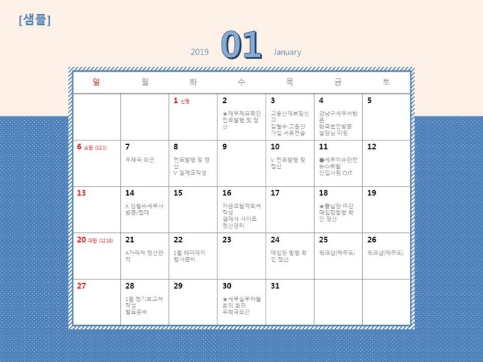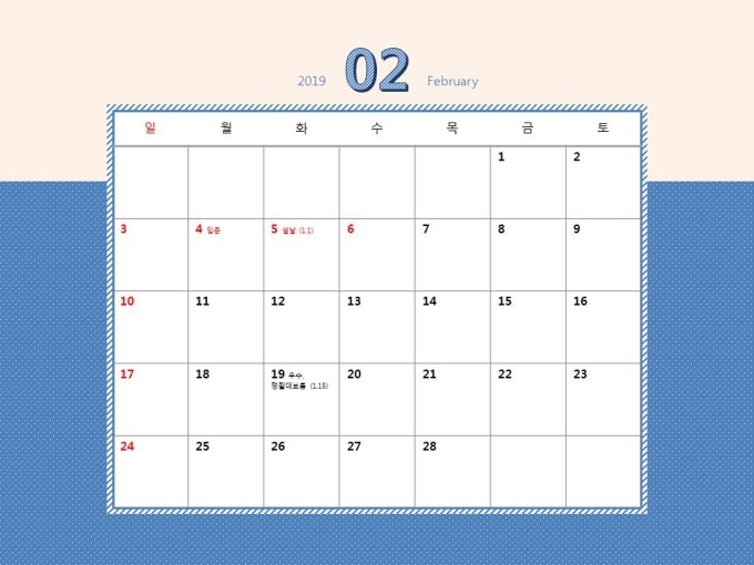 2019년 달력(월별일정,PPT달력,데스크매트용)입니다. 시트별로 월별달력이 구분되어 있으며 인쇄하여 데스크매트 밑에 끼워서 월별로 일정을 정리할 수 있습니다. 월간일정, 월별달력, 일정관리, 스케줄관리에 효율적으로 사용할 수 있습니다. 부착형, 액자형, 다이어리형 등 여러 가지 형태로 다양하게 활용해보세요.