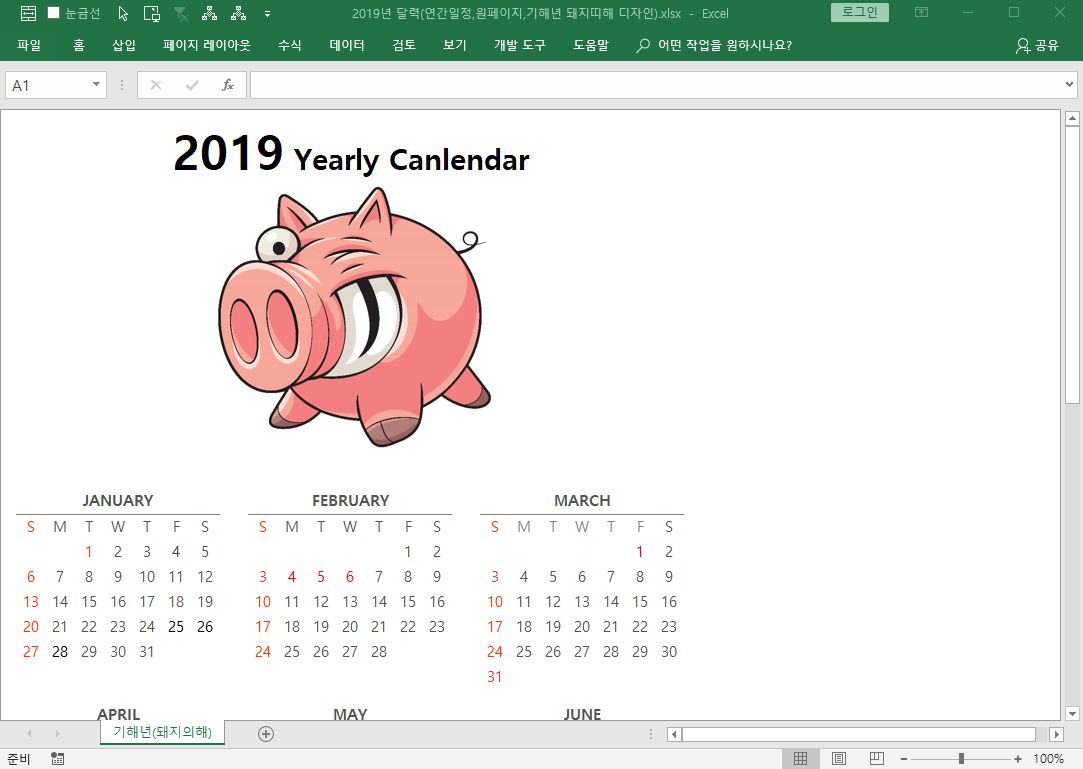 2019년 달력입니다. 기해년, 돼지의 해를 맞이하여 귀여운 돼지의 캐릭터와 화이트 배경의 깔끔한 디자인을 활용하여 원페이지로 제작되어 연간일정을 관리하시기 편리하도록 제작하였습니다