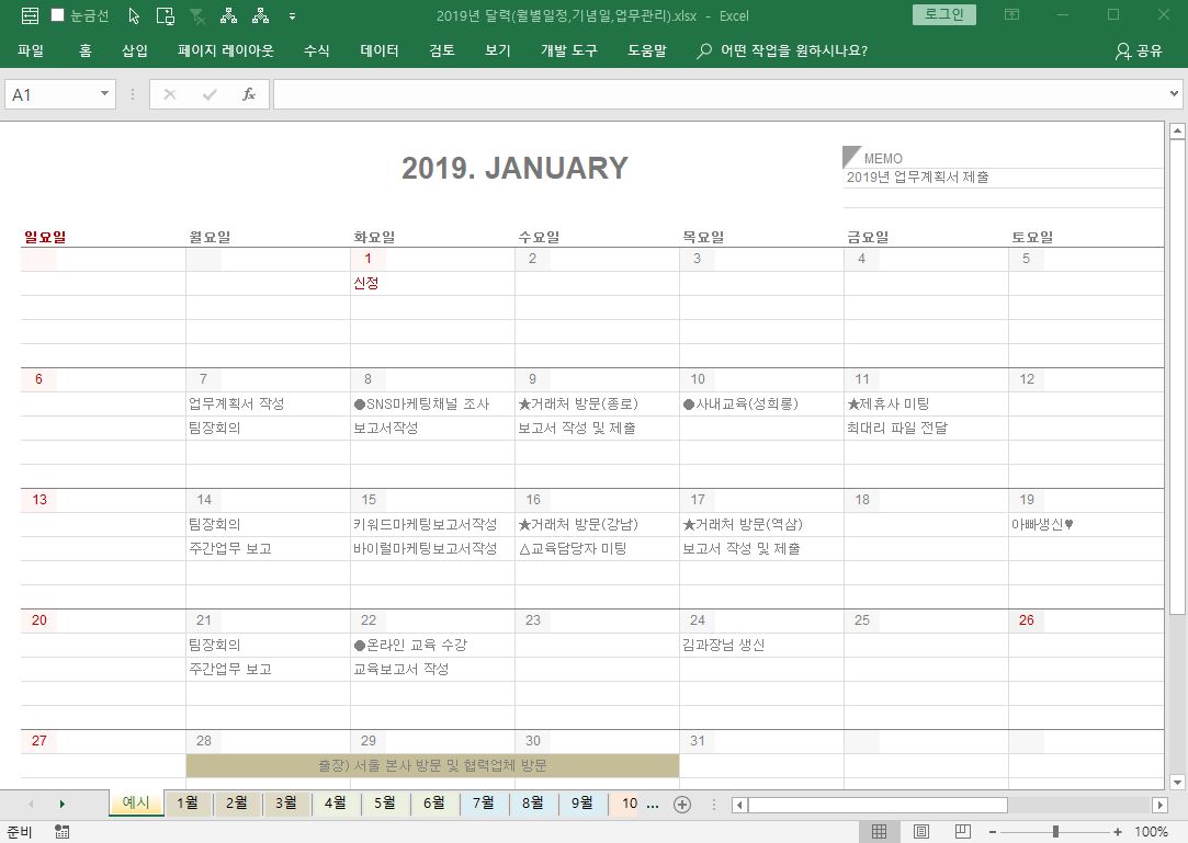 2019년 달력입니다. 월별일정 및 기념일, 업무관리 또 한 가능하도록 제작하였으며 깔끔한 하고 심플한 디자인을 활용하였습니다