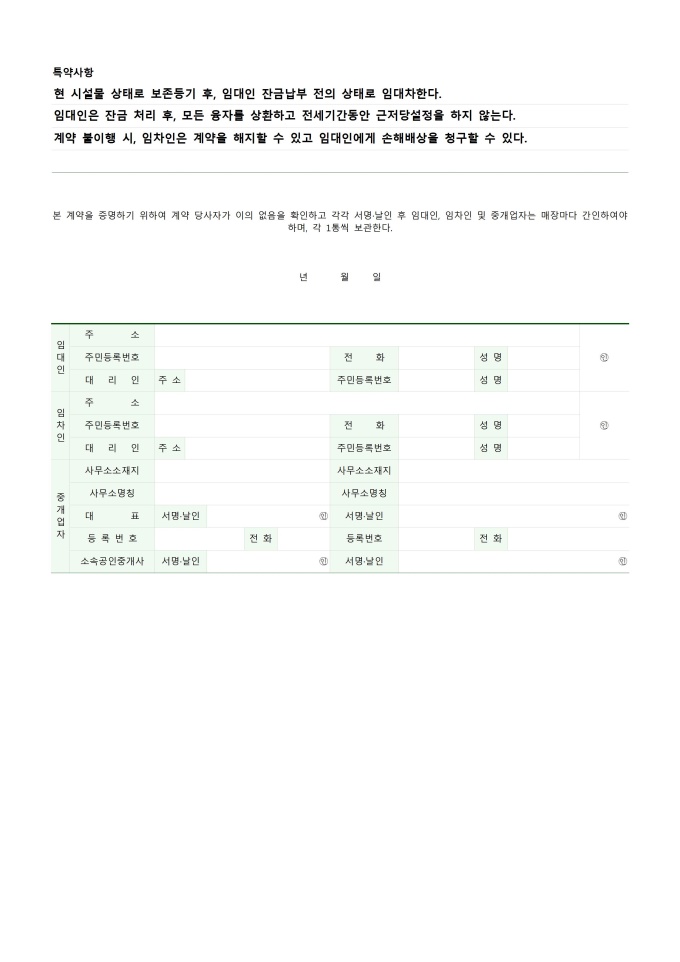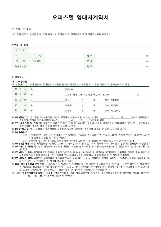 9,000원/월해당 서식은 오피스텔을 임대하는 상황에서 작성하는 표준 계약서입니다. 일반적으로 오피스텔은 오피스와 호텔의 합성어로 주거용과 사무용으로 분류하여 등록되어 있습니다. 용도에 따라 세금이 달라지기 때문에 명시가 오피스텔계약의 핵심사안입니다. 일반적인 부동산 계약서에 포함되어 있는 임대계약의 금액, 계약의 해지, 해제, 종료, 주차시설과 함께 오피스텔의 용도를 명시한 조항이 추가되어 있습니다. 등기가 올라가 있지 않은 미등기 오피스텔을 계약할 때 사용하는 오피스텔 임대차 계약서 샘플입니다. 근저당설정과 계약 불이행 시, 계약해지와 더불어 손해배상까지 청구할 수 있다는 내용으로 작성되었습니다. ※ 부동산 임대차계약서 모음전 [바로가기] - 임대목적물 내부 체크리스트 [바로가기] - 임대목적물 내부 체크리스트 [바로가기] - 이사 전 체크리스트 [바로가기] - 임대 계약 전 체크리스트 [바로가기]