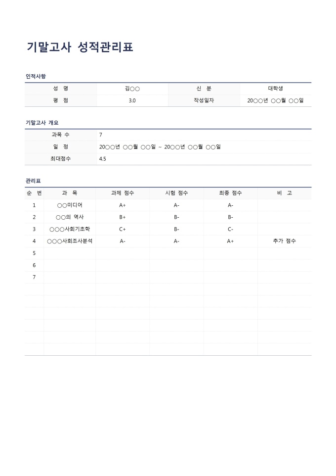 9,000원/월기말고사성적관리표입니다. 성명, 신분, 평점, 작성일자, 과목 수, 일정, 최대점수, 순번, 과목, 과제 점수, 시험 점수, 최종 점수, 비고 등의 항목으로 구성되어 있습니다.