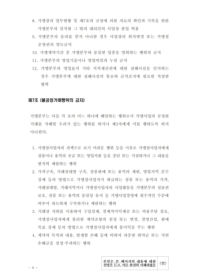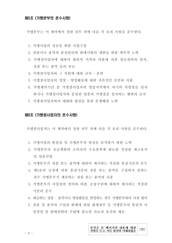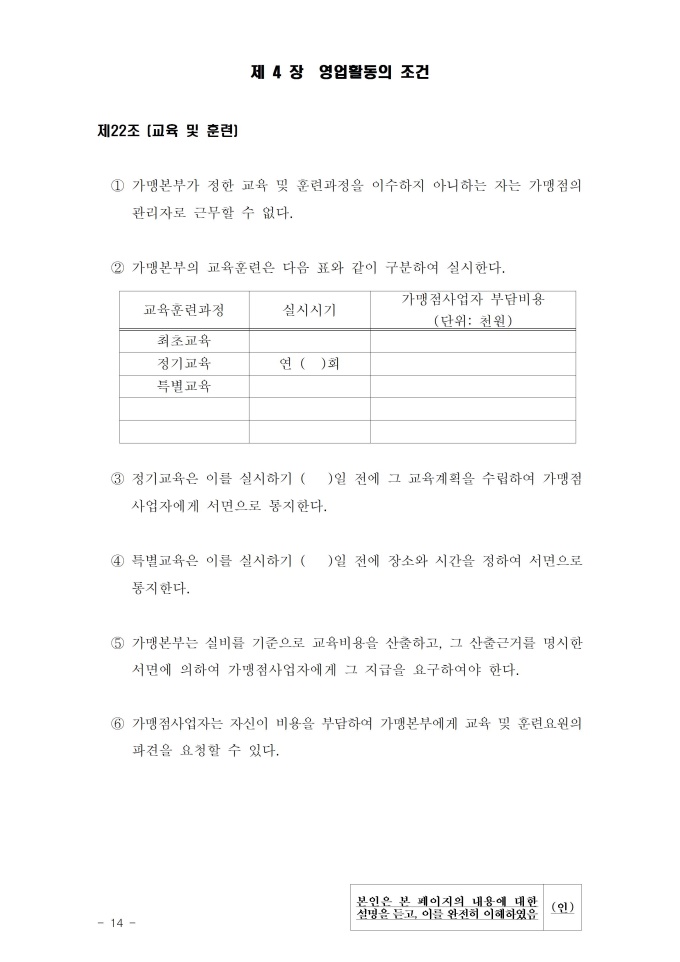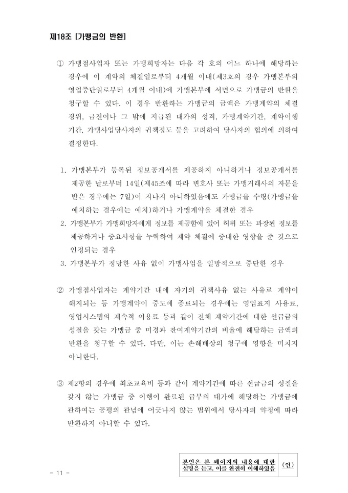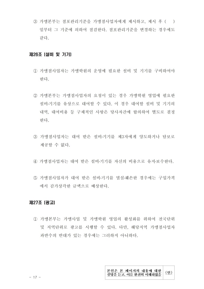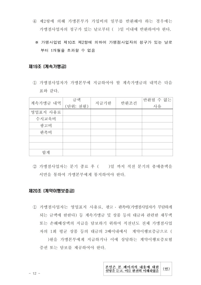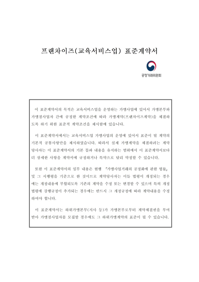 9,000원/월[2017.12. 개정] 파일입니다. 프렌차이즈(가맹점) 표준계약서 입니다. 프렌차이즈(가맹점)을 창업을 할 때 가맹본부와 가맹희망자가 공정한 계약서를 통하여 거래를 진행하는 내용으로 '교육서비스업'의 사업 아이템을 바탕으로 작성되어 있습니다. 희망자는 불이익적인 사항이 없는지 잘 확인하고 계약을 진행하여야 하며, 가맹 본부는 희망자의 거짓된 정보 및 과도한 이익을 위한 요구를 확인 하여야 합니다. 출처 : 공정거래위원회