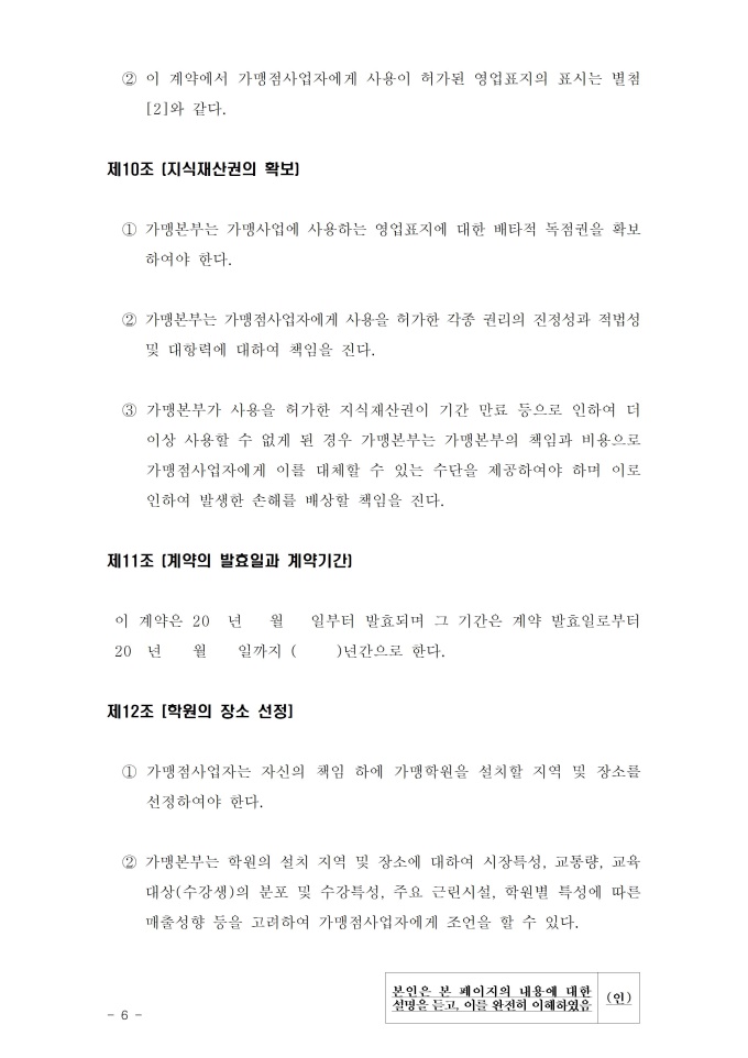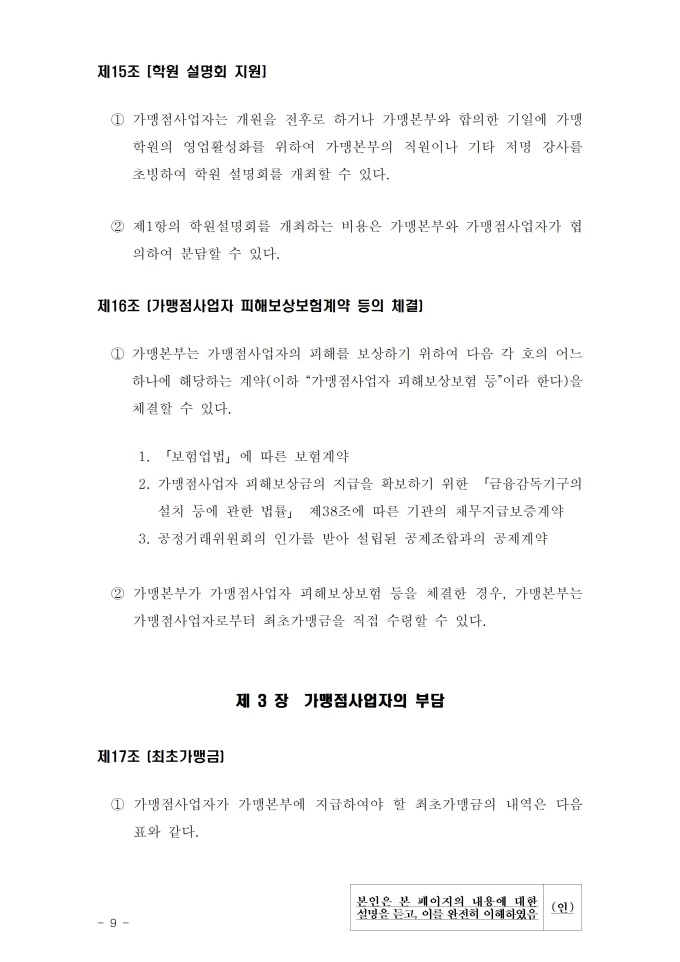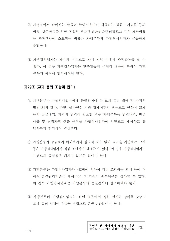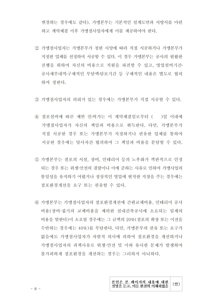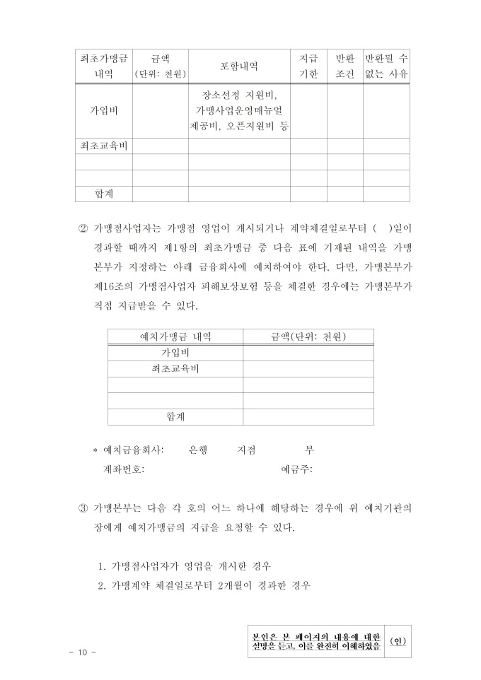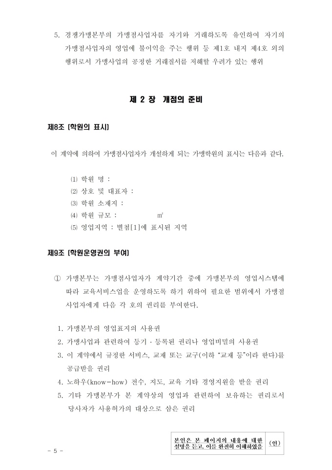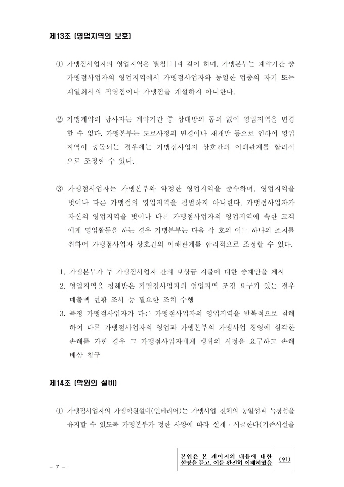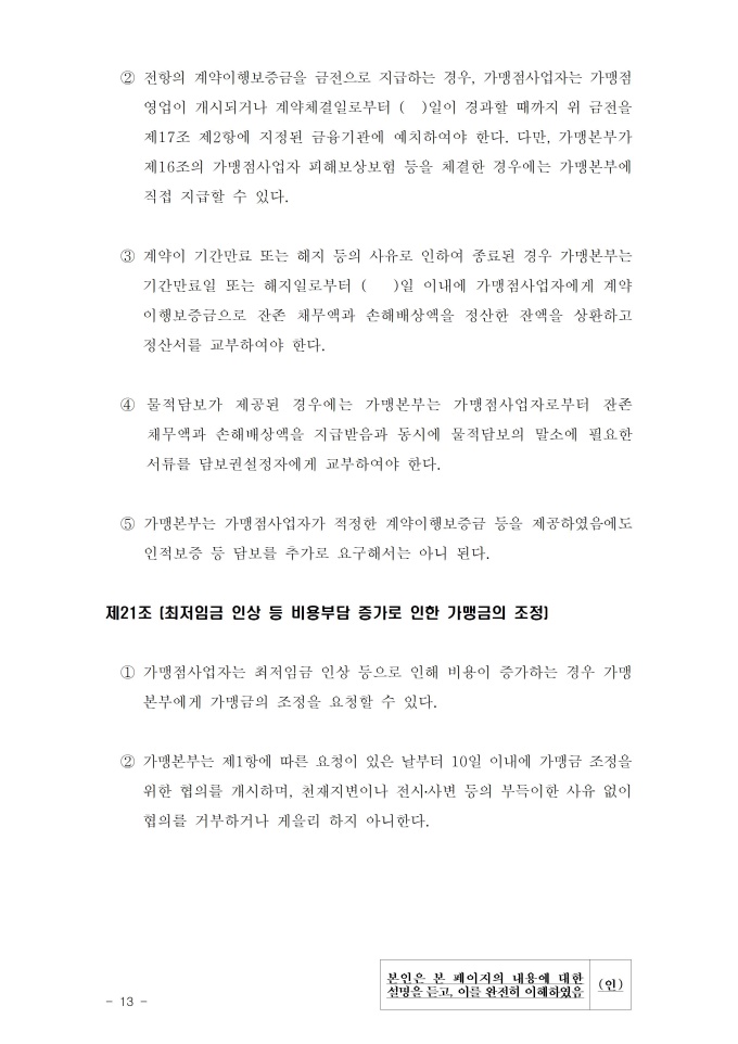 9,000원/월[2017.12. 개정] 파일입니다. 프렌차이즈(가맹점) 표준계약서 입니다. 프렌차이즈(가맹점)을 창업을 할 때 가맹본부와 가맹희망자가 공정한 계약서를 통하여 거래를 진행하는 내용으로 '교육서비스업'의 사업 아이템을 바탕으로 작성되어 있습니다. 희망자는 불이익적인 사항이 없는지 잘 확인하고 계약을 진행하여야 하며, 가맹 본부는 희망자의 거짓된 정보 및 과도한 이익을 위한 요구를 확인 하여야 합니다. 출처 : 공정거래위원회
