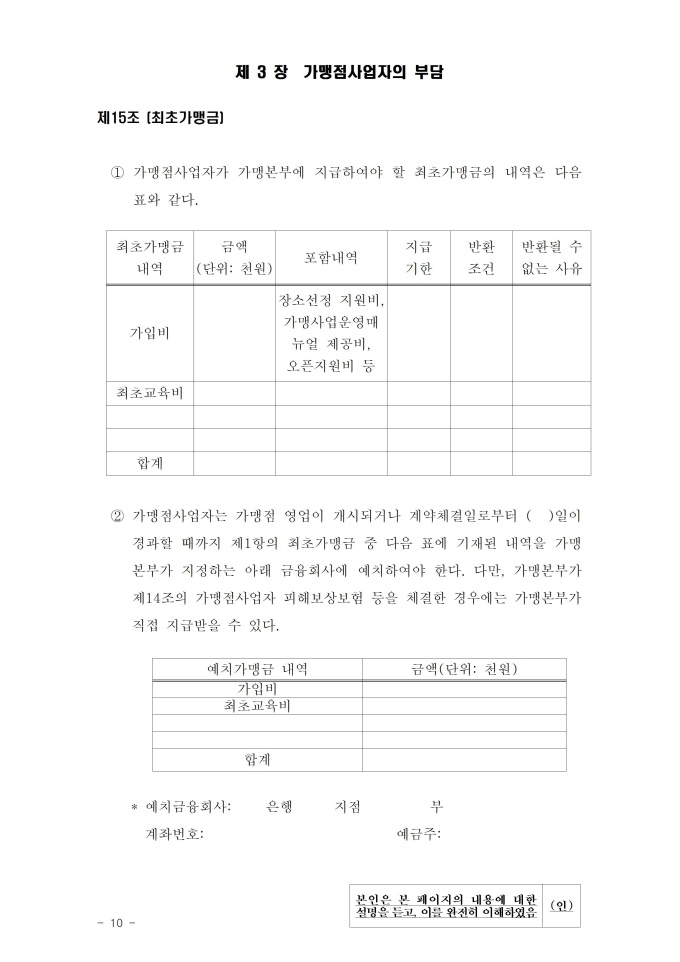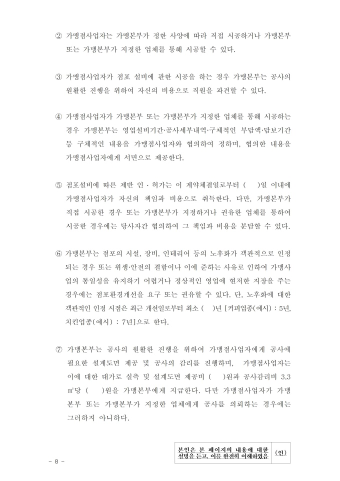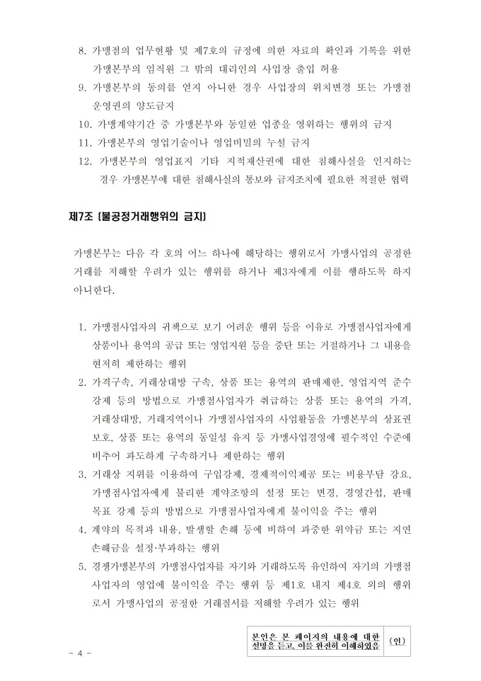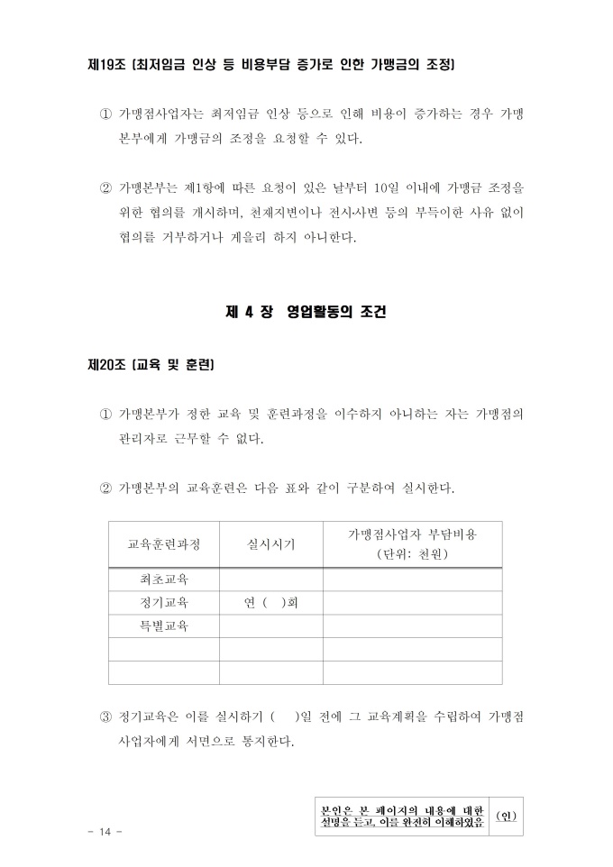 9,000원/월2019년 1월 개정된 내용이 추가 된 외식업 표준 가맹계약서 입니다. 외식업에 대한 가맹점계약서이며, 가맹본부는 가맹점 희망자(사업자)의 공정한 가맹점의 내용을 기재해놓았다. 가맹점 희망자(사업자)는 거짓되거나 불이익적인 조항이 있는지 확인하고 가맹본부는 가맹점 희망자가 거짓된 이야기 및 자본이 있는지를 자세히 확인하여야 한다. 개정된 내용으로는 다음과 같다. 1. 오너리스크에 따른 가맹본부의 배상 책임명시 2. 영업지역 변경 요건 현행화 3. 보복조치 금지 규정 신설 출처 : 공정거래위원회