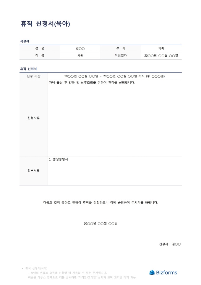 9,000원/월육아휴직신청서입니다. 휴직의 사유가 육아인 경우에 신청기간, 신청사유, 첨부서류를 바탕으로 작성할때 사용할 수 있는 문서입니다.