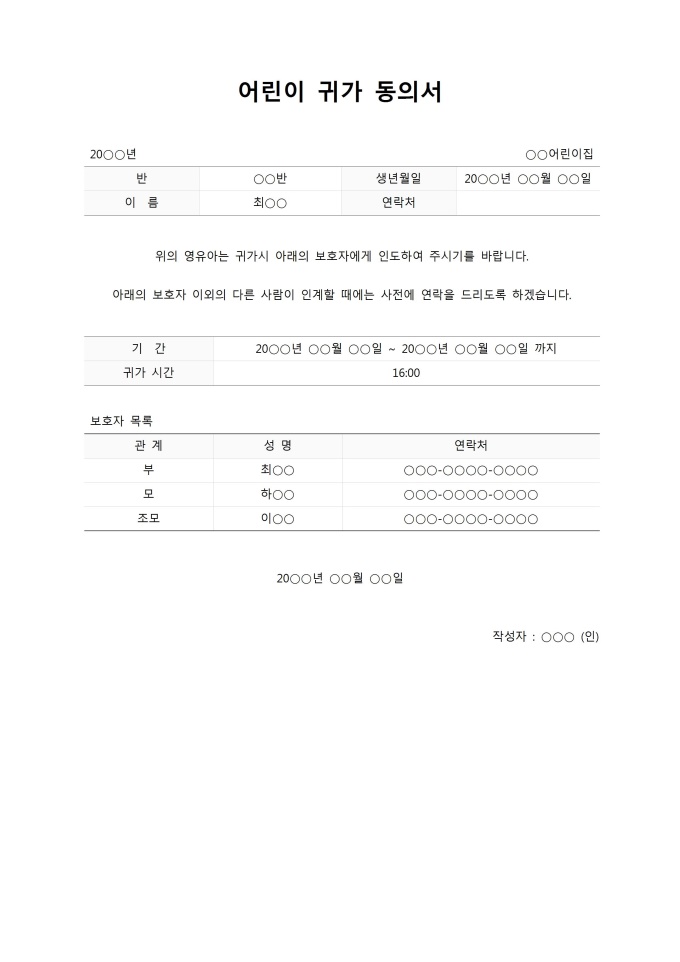 9,000원/월어린이 귀가 동의서 입니다. 어린이집에서 어린이가 귀가를 할때 어린이를 데리러 오는 사람에 대하여 귀가를 동반으로 허락하는 내용의 동의서 입니다.