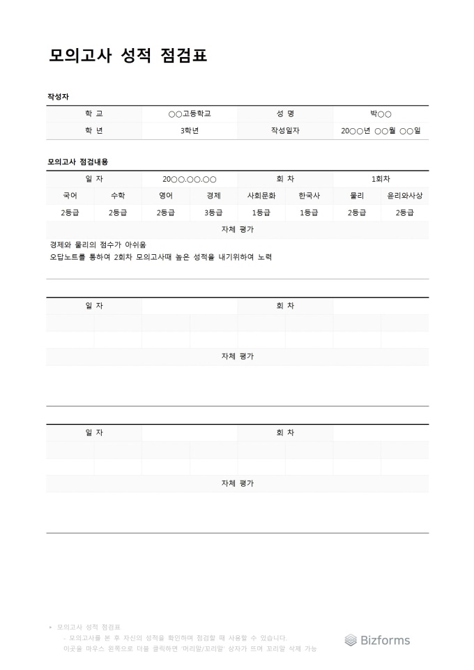 9,000원/월모의고사 성적 점검표 입니다. 학생이 모의고사의 성적을 등급으로 나누어 회차마다 성적을 점검, 스스로에게 피드백을 할때 사용할 수 있는 문서입니다.