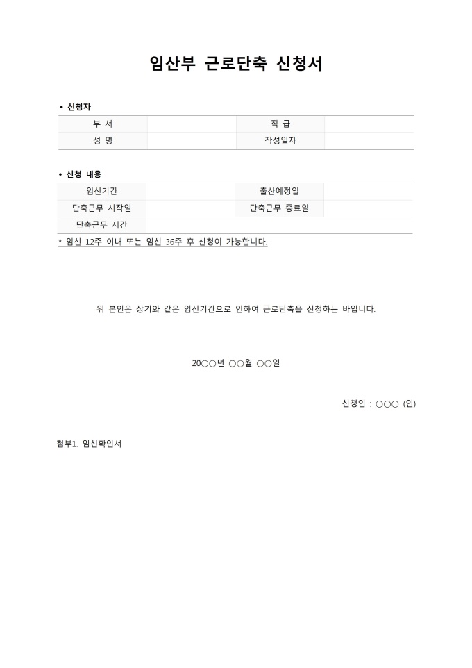 9,000원/월임산부 단축근무 신청서 입니다. 임신 기간 중 단축근무를 희망할때 정확한 일정과 시간을 작성하여 제출할때 사용할 수 있습니다.