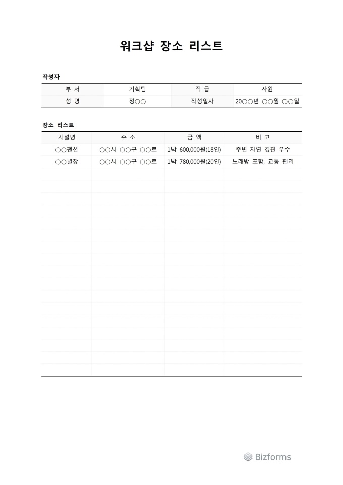 9,000원/월워크샵장소리스트 입니다. 워크샵을 진행할때 워크샵을 진행할 장소에 대한 간단한 설명을 리스트화 할때 사용할 수 있는 문서입니다.