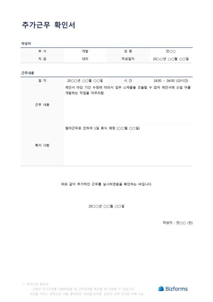 9,000원/월추가 근무 확인서 입니다. 특별한 사유로 추가근무를 진행하였을때 시간과 상황등을 작성하여 확인할때 사용할 수 있습니다.