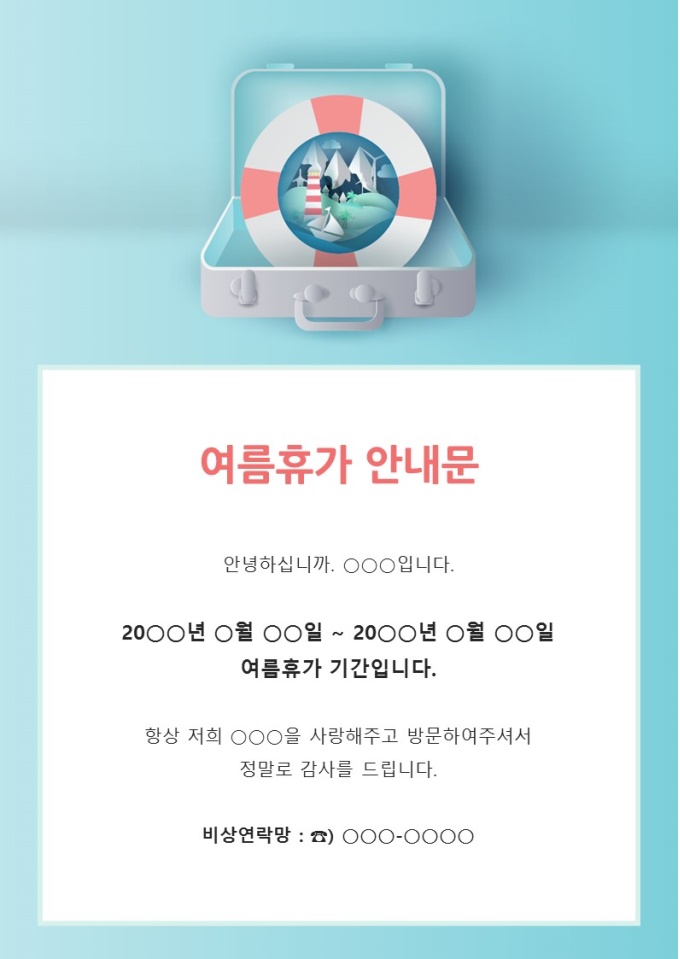 여름휴가 안내문 입니다. 여름휴가를 진행한다는 내용을 안내할때 사용할 수 있는 문서입니다.