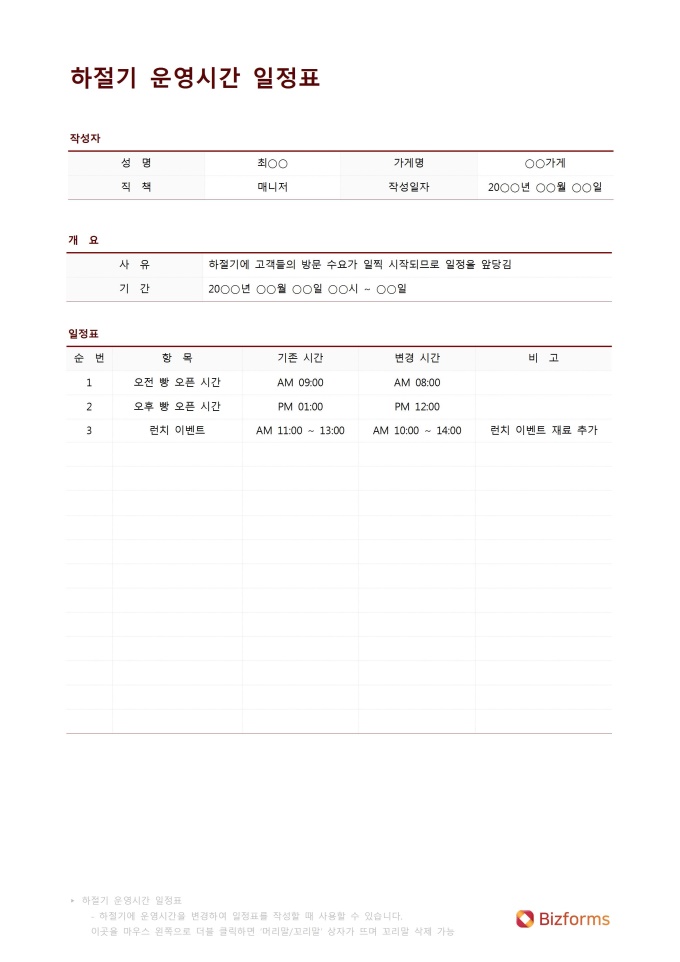 9,000원/월하절기운영시간일정표입니다. 하절기에 운영시간을 바꾸어 운영할 때 작성하여 사용할 수 있는 문서입니다.