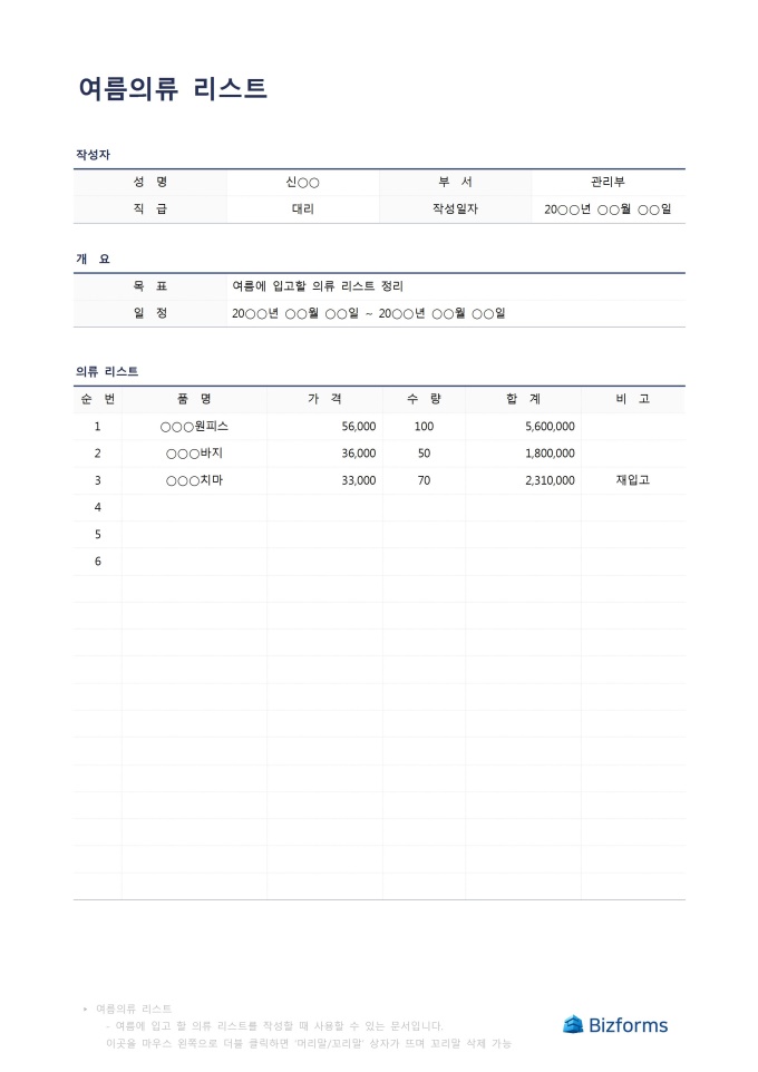 9,000원/월여름의류리스트입니다. 여름에 구입하는 의류 리스트를 작성할 때 사용할 수 있는 문서입니다.