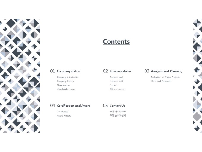 IT, 온라인 업계에서 사용하기 적합한 브로슈어형 PPT입니다. 조금은 복잡한 패턴이지만 무채색을 사용하여 차분함을 느낄 수 있습니다. 회사소개서 표준 목차에 맞춰 다이어그램, 표, 그래프를 구성하였으며, 모든 슬라이드에 구성된 도형 및 그래프는 편집이 용이하도록 제작되었습니다.