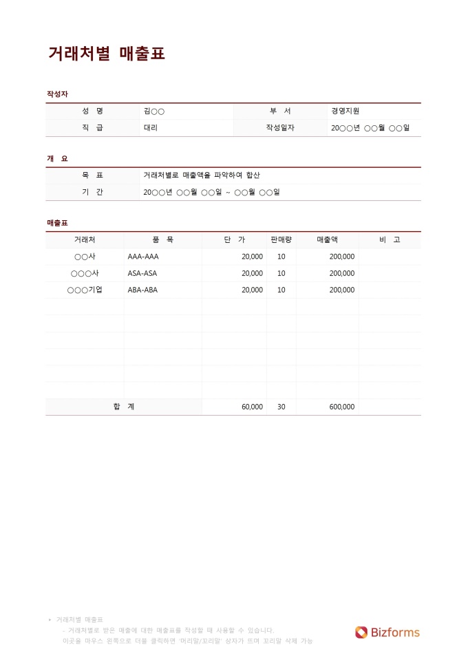 9,000원/월거래처별매출표입니다. 거래처별로 매출액 등을 정리하여 표를 작성할 때 할 수 있는 문서입니다.