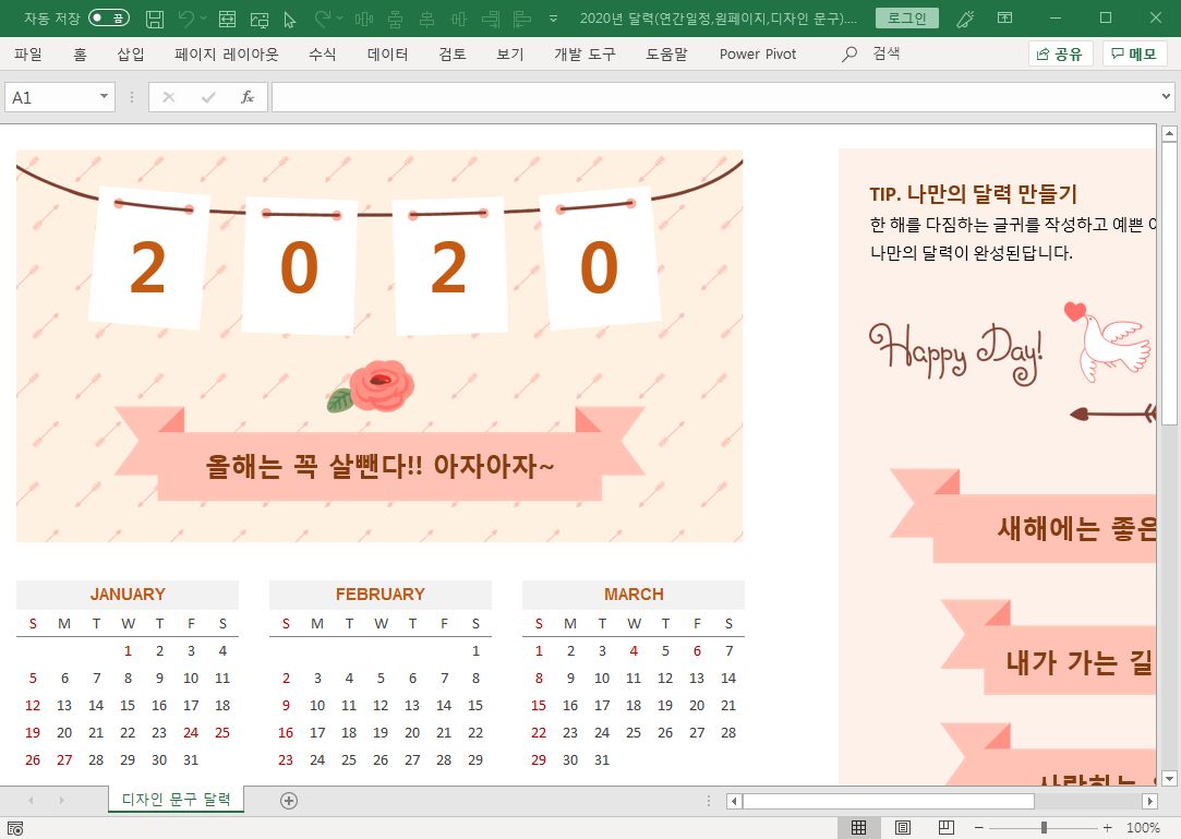 2020년 달력입니다. 원페이지로 제작되었으며 귀여운 폰트와 디자인으로 나만의 달력을 만들수도 있습니다.
