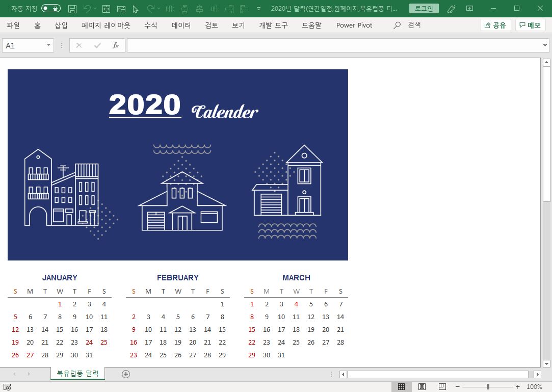 2020년 달력입니다. 깔끔하고 심플한 북유럽풍의 디자인을 활용원페이지로 제작되었습니다.