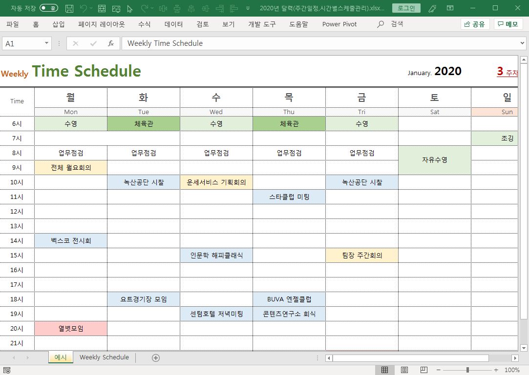 2020년 달력입니다. 원페이지로 제작되어 주간일정을 시간대별로 관리하실 수 있습니다.