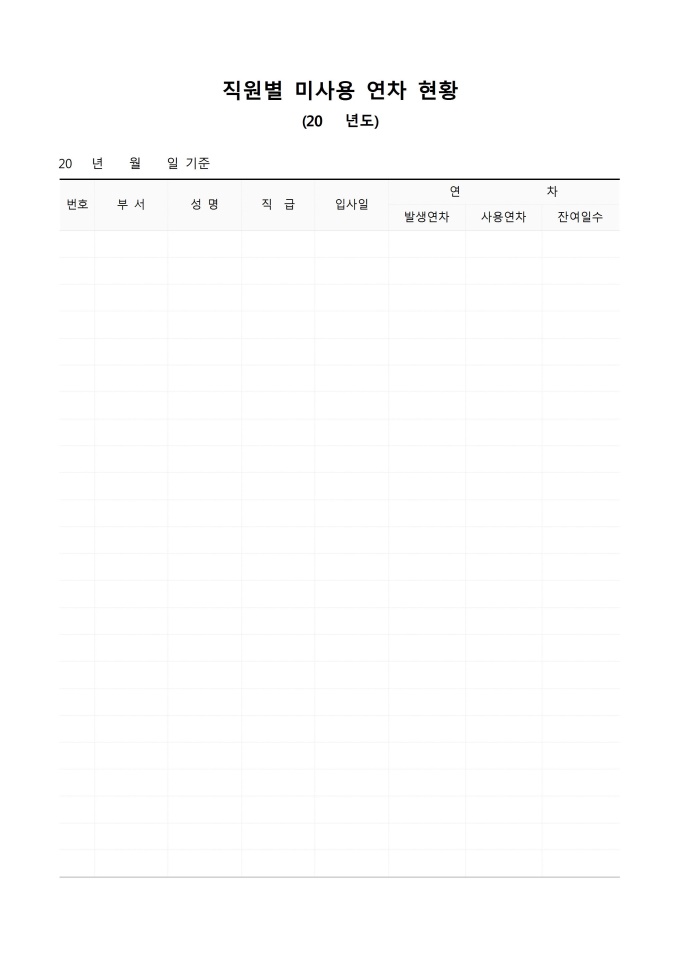 9,000원/월직원별 남아있는 연차휴가의 현황을 년도별로 확인할 수있는 미사용 연차 휴가 내역서 입니다.