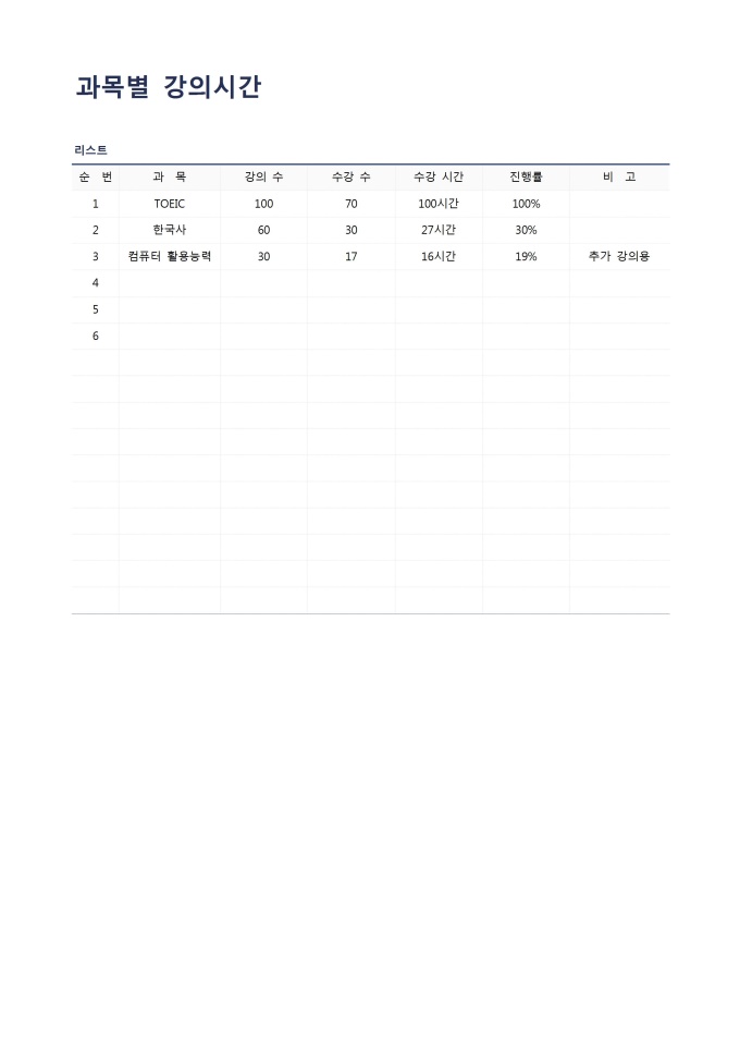 9,000원/월과목별강의시간입니다. 과목별로 강의 시간을 작성할 때 사용할 수 있는 문서입니다.
